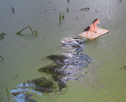 Then I headed out across a large swamp. You can see my trail through the duckweed behind my boat. There were a lot of plants sticking up; I tried not to run into too many of them.