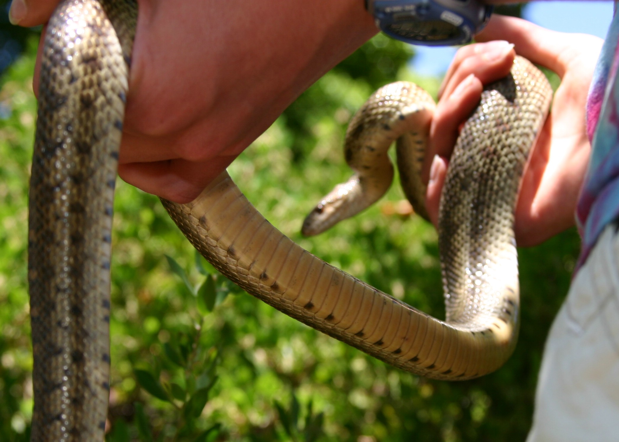 My daughter holding a small pacfic gopher snake. My only beef with these guys is that they don't digest gophers more quickly! Picture taken June 2005.